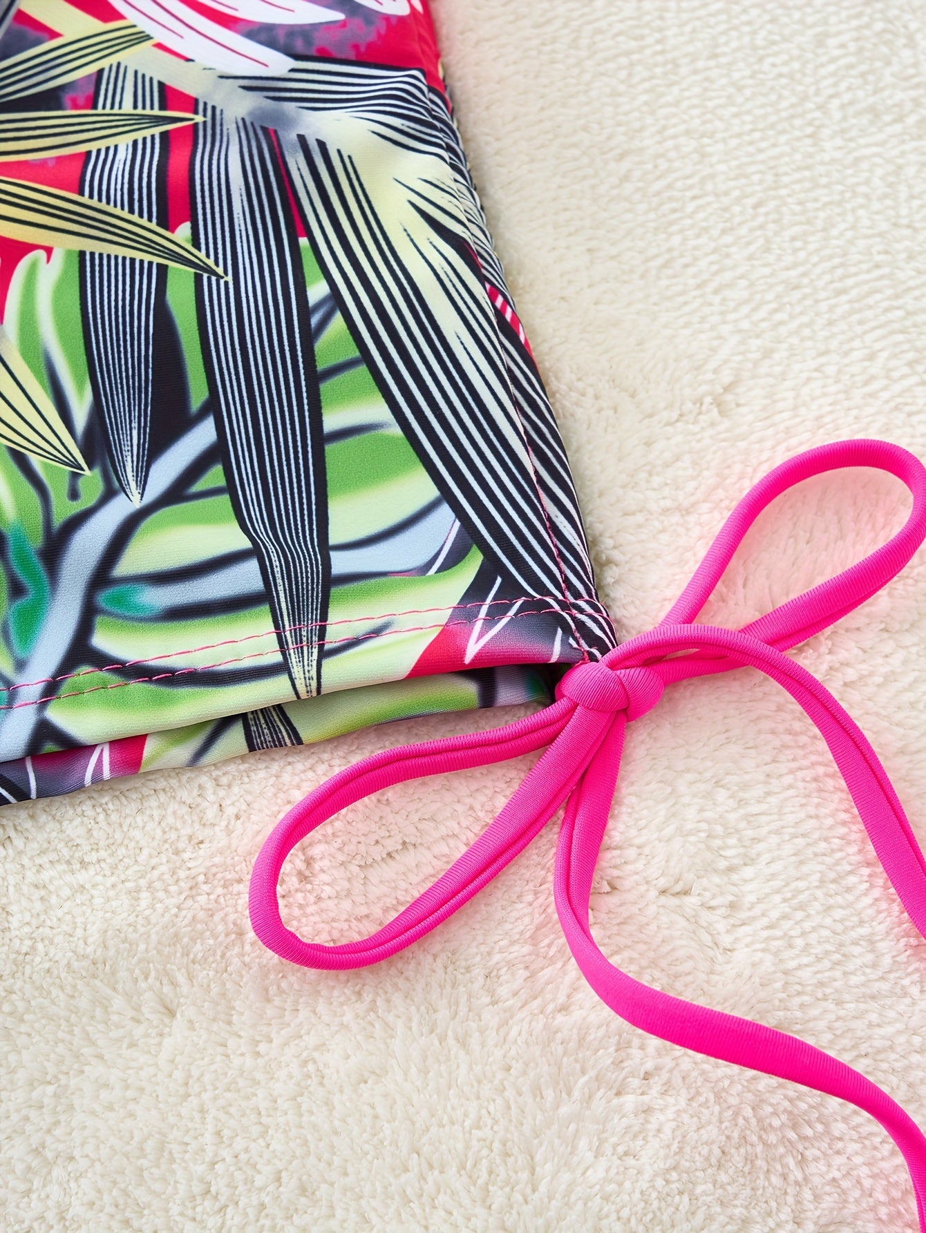High-Waisted Adjustable Tie-Front Women's Bikini Set with Tropical Print Boyshort Bottoms, Beachwear Swimwear