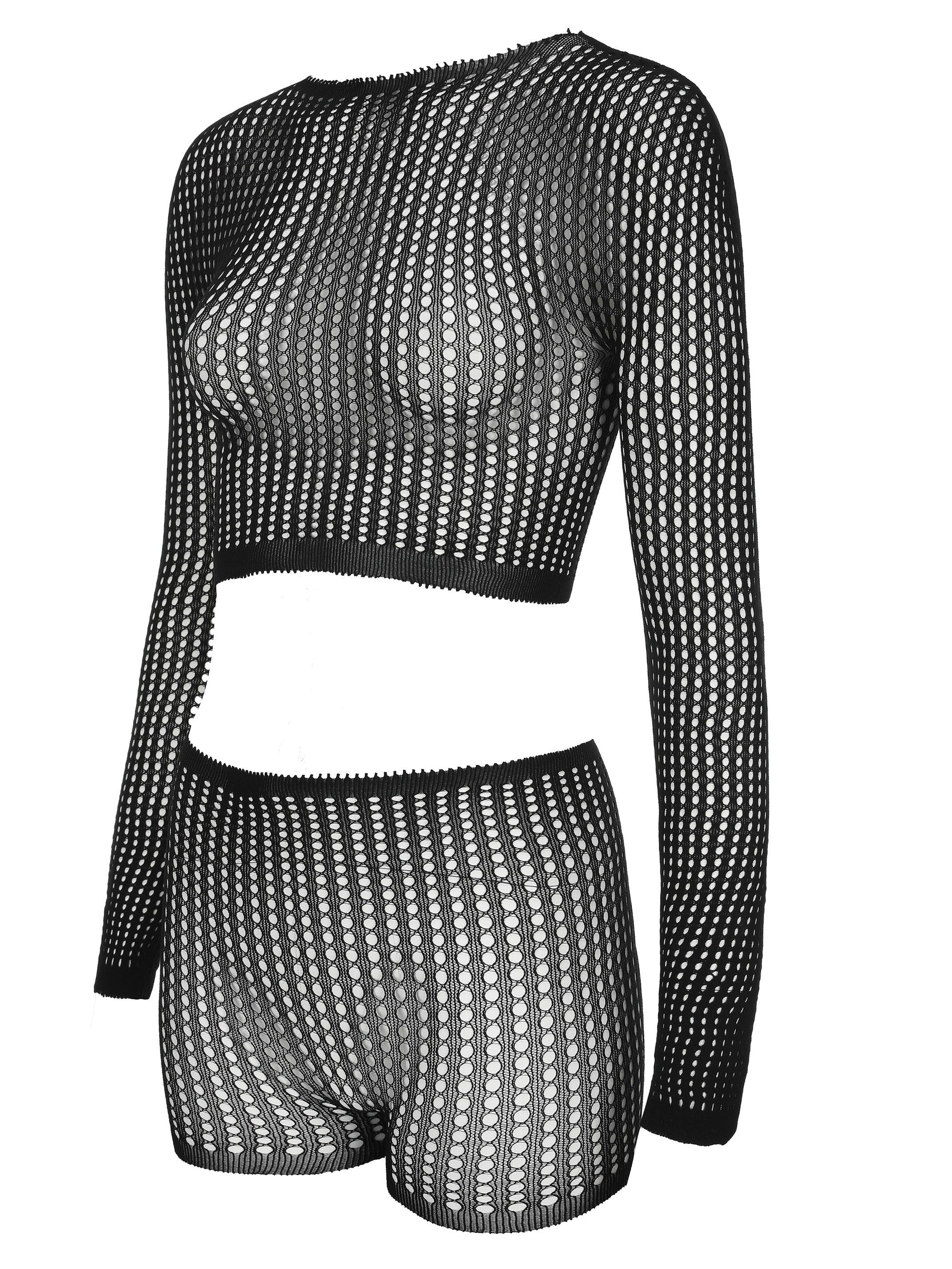 Two-Piece Sexy Hollow Out Mesh Long Sleeve Crop Top and Shorts Set - Breathable, Stretchy, Sheer Cover-Ups for Beachwear - High Stretch Polyamide Fabric, Solid Color, No Printing, Knit Fabric
