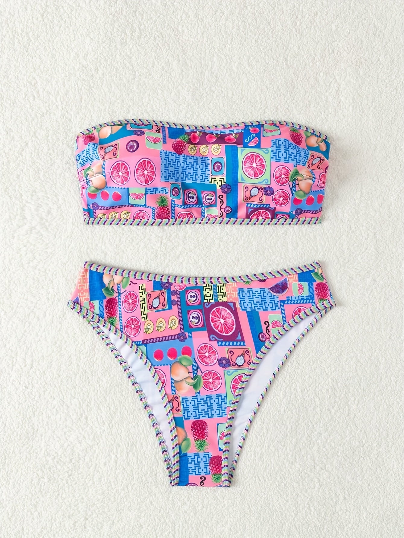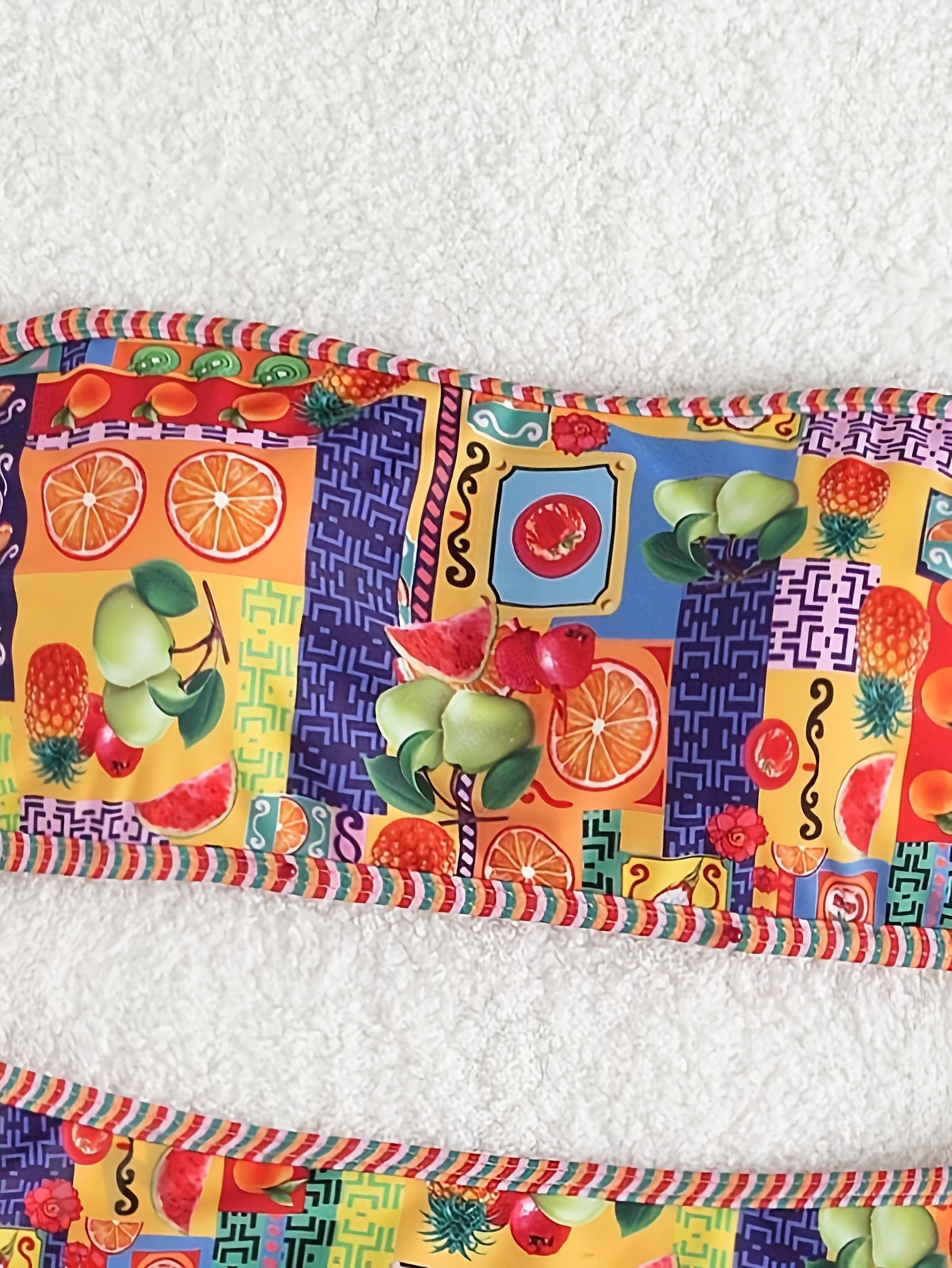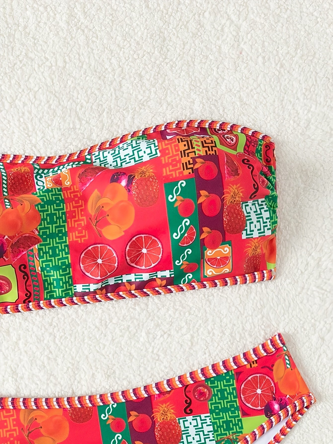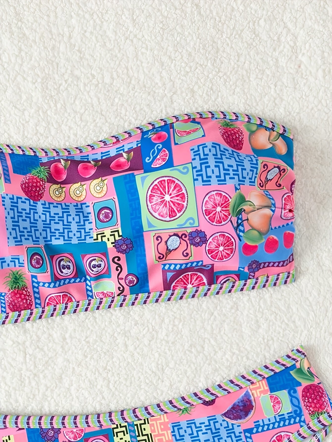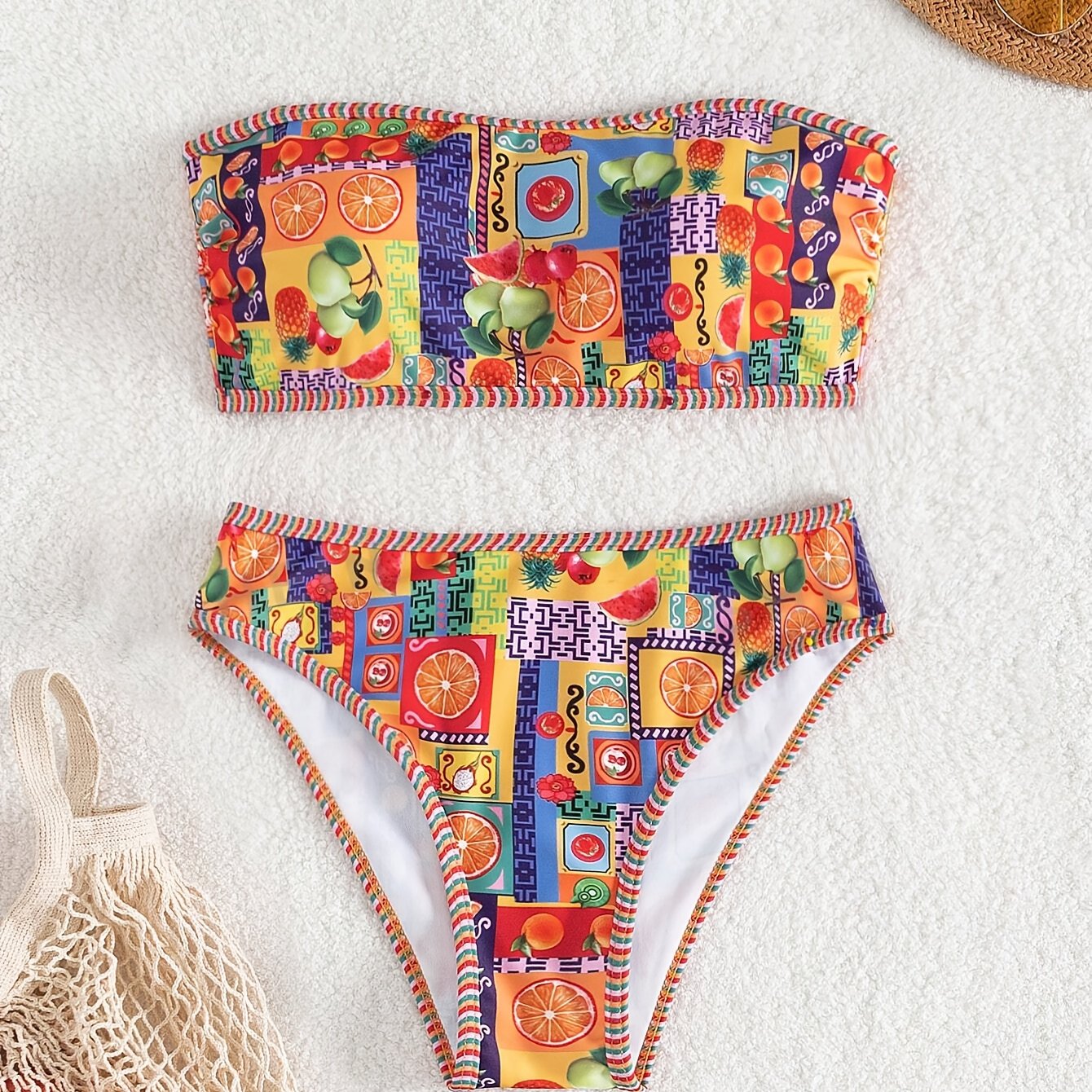 Vibrant Fruit Print High Cut Two-Piece Strapless Bikini Set - Fashionable Beachwear with Adjustable Straps, Padded Cups, and Ruffled Trim - Perfect Women's Summer Swimwear for Beach, Pool, or Vacation