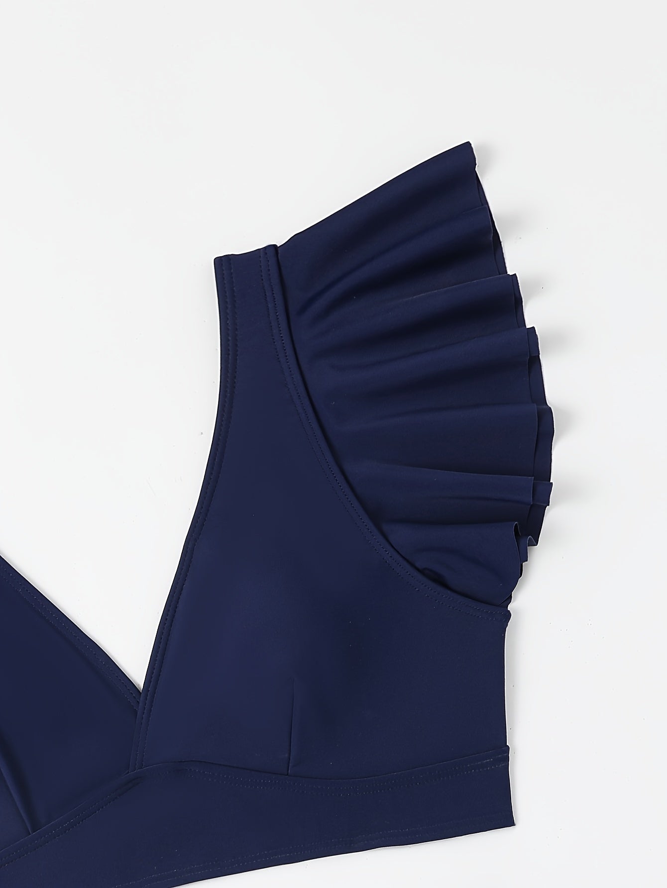 Women's Ruffled Bikini Set, Floral High-Waisted Floral Bottoms, Navy Blue Top, Beachwear, Swimwear, Fashionable Summer Poolside Outfit, Vacation Essentials